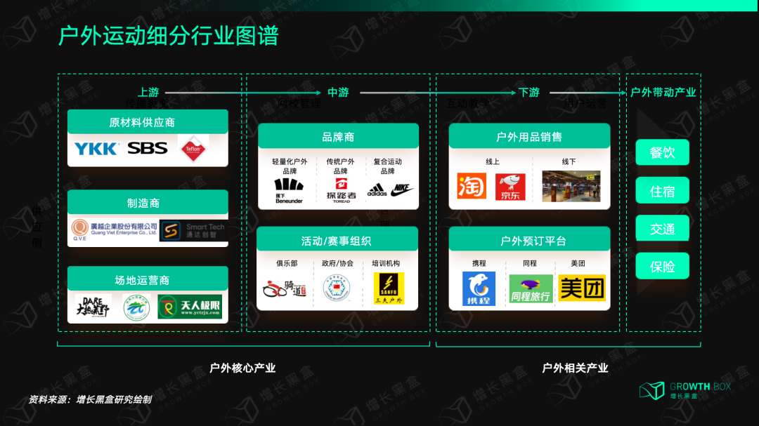目前,户外运动行业产业链上游主要包括户外用品的原材料供应商、成品制造商及户外活动场地的运营商。