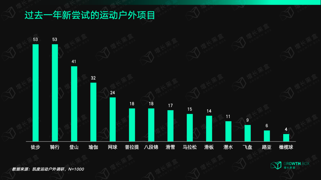 凯度运动户外调研数据显示,徒步、骑行、登山的经典三大项成为过去一年新用户尝试最多的三种运动,更加养生的瑜伽、普拉提、八段锦也颇受欢迎,而网球、滑雪等竞技项目也不再是运动员和极限爱好者的专属,同时滑板、橄榄球等城市运动正在成为年轻人的新宠。