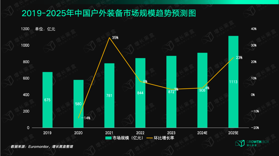 运动户外人群规模的增长和更进阶的垂直类目进一步打开了户外运动消费者的装备需求,自2020年起,我国的户外装备市场规模一直呈现出显著增长的态势,预计到2025年将突破千亿市场规模。