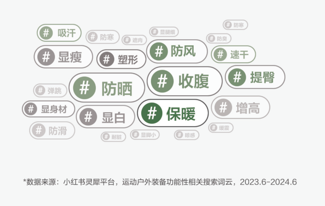 从2024年小红书用户搜索运动户外装备的情况来看,防风、防水和速干等关键词占比同比提升了30%,同时,消费者也想通过更有时尚美感的运动着装来展现元气满满的生活态度,防晒、塑形还有显白等关键词同样是消费者的搜索重点。