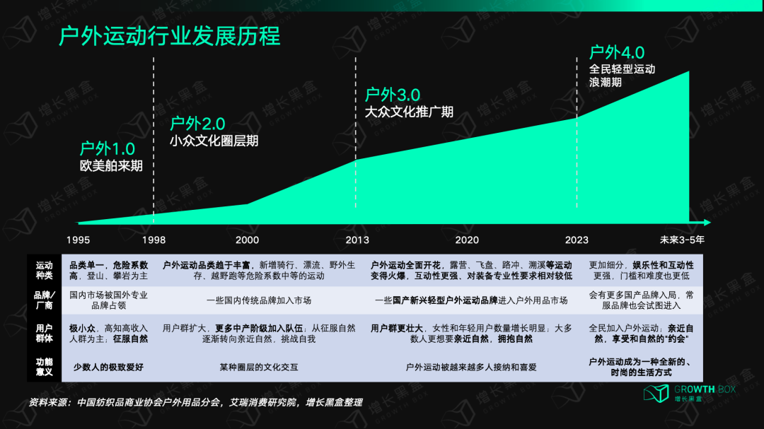 自上世纪90年代以来,我国的运动户外行业经历了了四个阶段的生长,这个生长过程有4个最主要的特征:一是从小众走向大众,二是从品类单一走向品类多元,三是从进口消费走向国货消费,四是从运动本身走向生活方式。