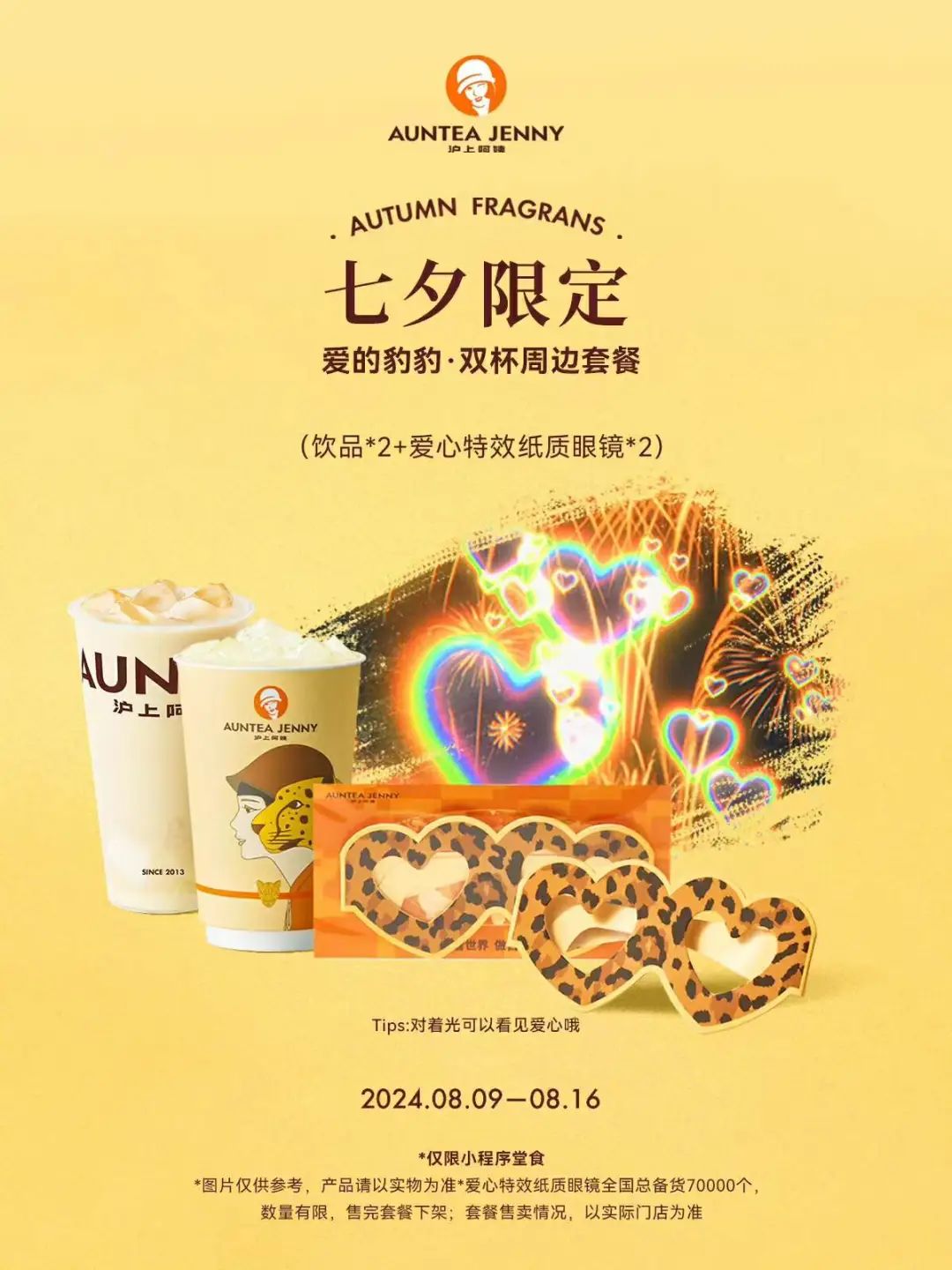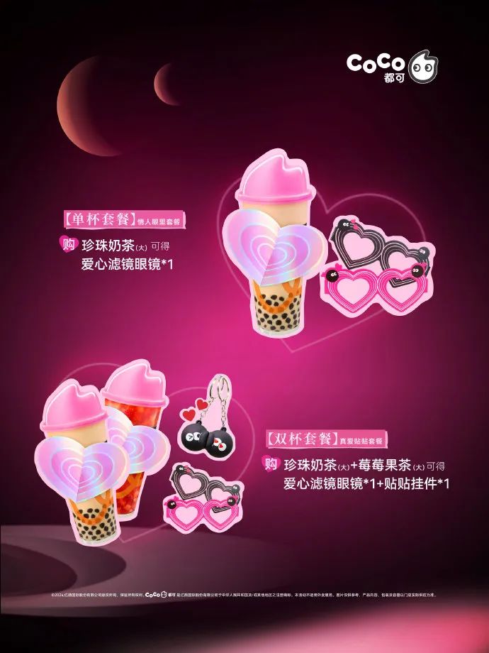 以趣味和爱意为主题,推出限定套餐。套餐中包含超可爱的爱心滤镜眼镜和贴贴挂件,让每一杯茶饮都成为爱的信号,甜蜜过七夕。