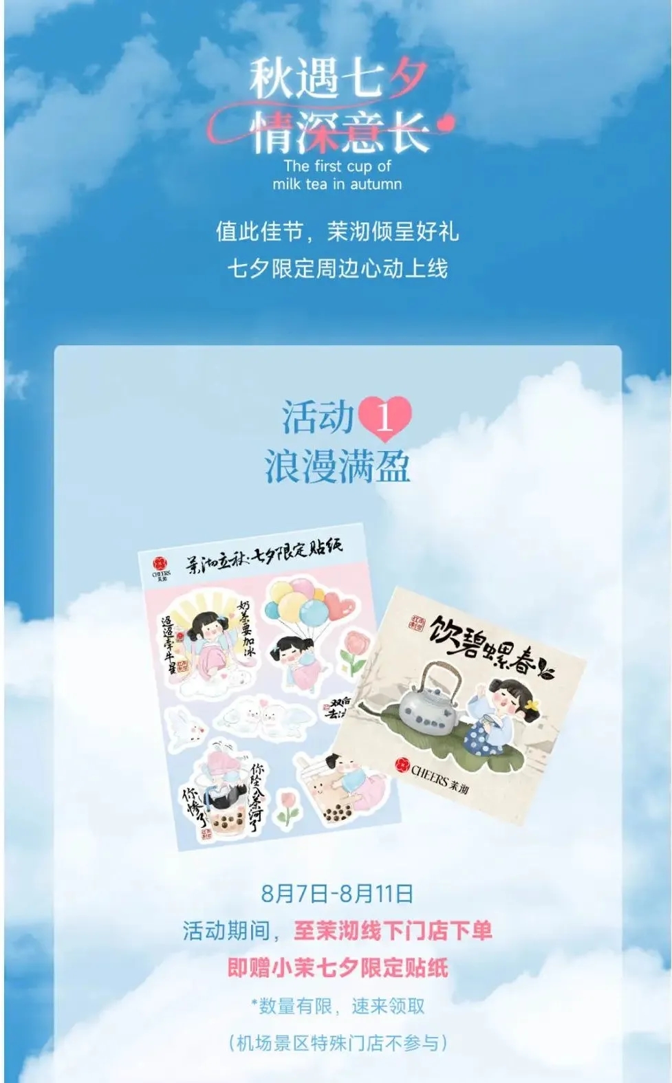 以幽默风趣的口号推出七夕限定冰箱贴和贴纸,如“迢迢牵牛星,奶茶要加冰”和“你惨了,你坠入爱河了”,为节日增添一抹趣味和欢笑。
