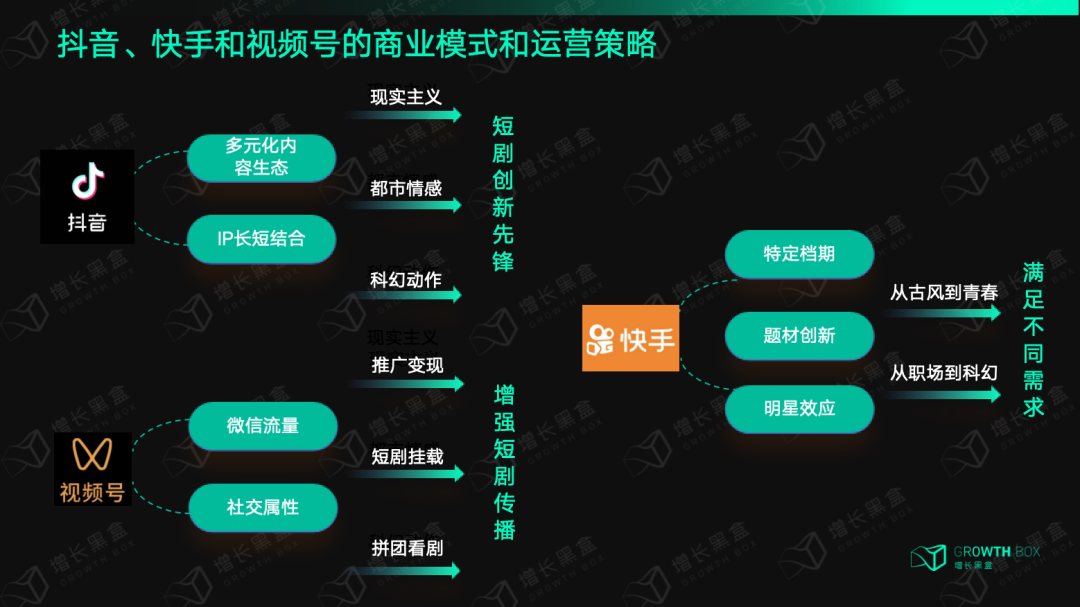 各大视频平台也纷纷下场入局,在过去两年里不断加大在短剧内容上的投入,将其作为新晋的主要内容赛道。其中,抖音、快手和视频号三大短视频巨头各显神通,摸索出了各自独特的商业模式和运营策略。