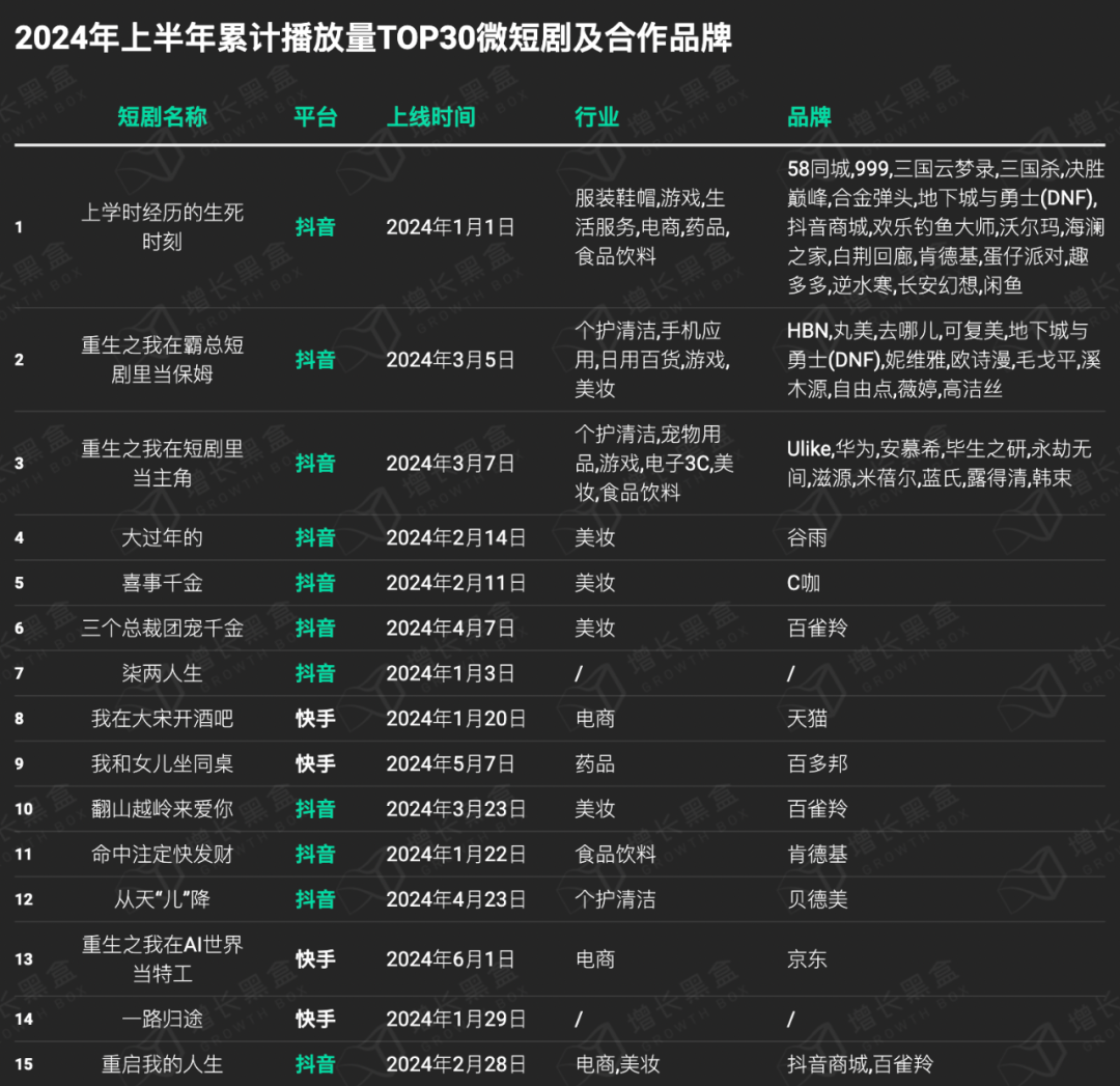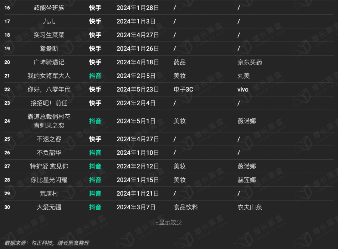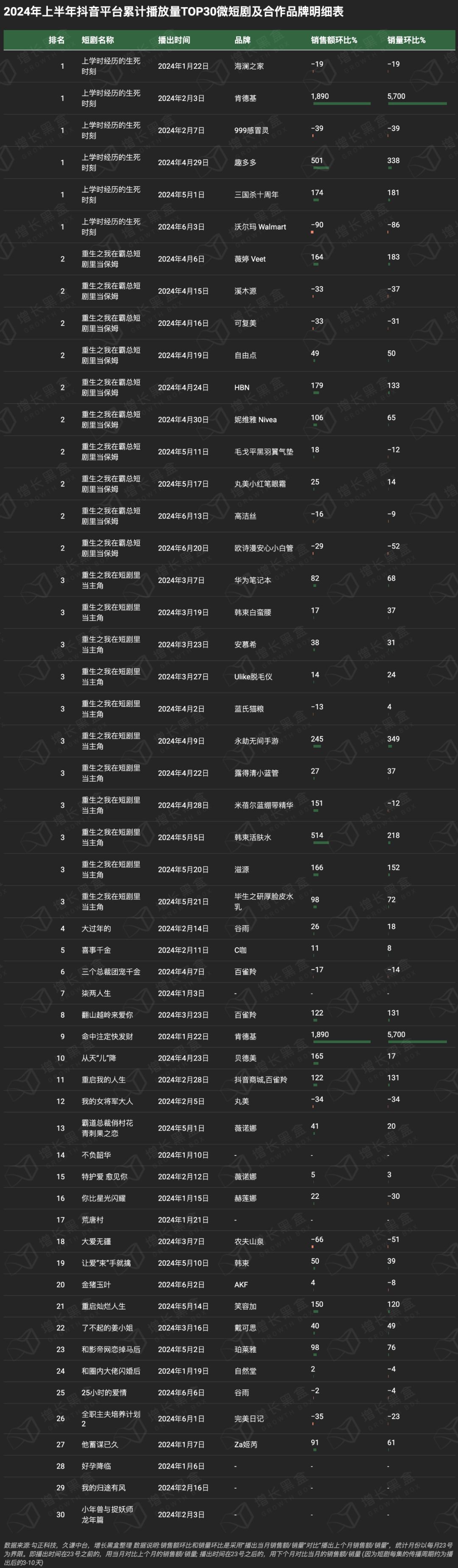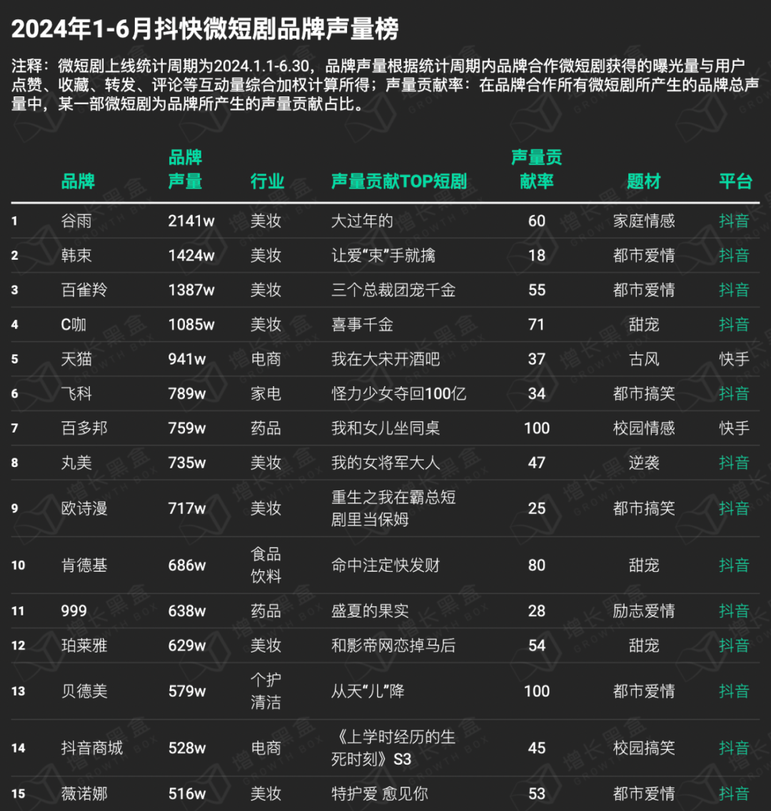增长黑盒联合勾正科技的调研数据显示,2024年上半年(2024.1.1-2024.6.30)微短剧品牌声量榜TOP30中(图表注释里有解释声量的统计方法),28个品牌都是与抖音短剧合作的,抖音占据了绝对优势。