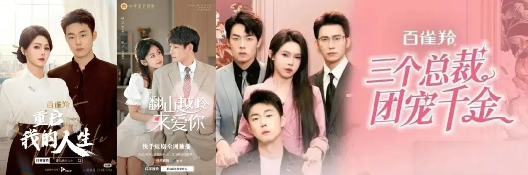 以排名第三的百雀羚为例,作为老牌国货美妆品牌,百雀羚目前总共推出了三部抖音短剧,分别是《重启我的人生》(2024.2.28开播)、《翻山越岭来爱你》(2024.3.23开播)和《三个总裁团宠千金》(2024.4.7开播)。