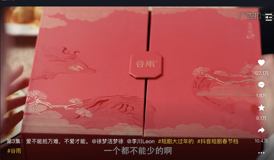 2024年初,谷雨通过抖音平台推出了两部特别定制的短剧:《大过年的》和《拾金·方屿一宁》。《大过年的》融合了青梅竹马、离婚和带球跑等戏剧性元素,该剧由知名演员徐梦洁和李川主演,上线14集,总播放量已超过10亿,单集点赞量最高达到167万。