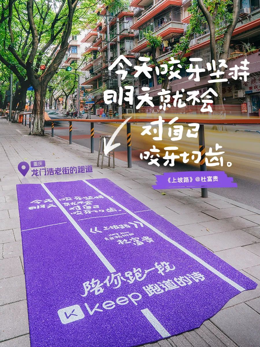 Keep浪漫跑「跑道的诗」第三季,以「陪你跑一段」为主题,将巴黎风情的紫色跑道和诗意浪漫融入我们的日常生活。在地铁旁、老街巷尾、电影院外……Keep把我们熟悉的城市变成了跑步的诗行。