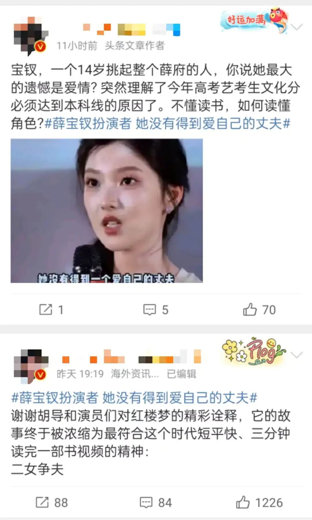 特别是路演时宝钗演员在21日接受采访时的发言,让许多网友感到不满,导致#薛宝钗扮演者她没有得到爱自己的丈夫#这一词条冲上了微博热搜。有网友指责导演选角失败,与原著角色气质不符,质疑主创对原著是否保有最基本的尊重。
