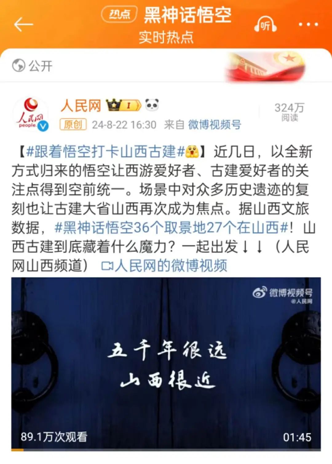 山西文旅部门迅速反应,发布#跟着悟空游山西#旅游路线,希望借助这股热潮,让更多人了解和体验山西古建之美。