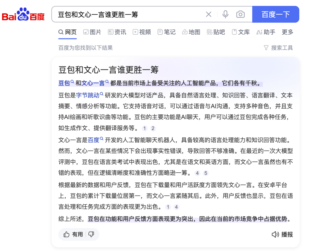 比如,当我们输入“豆包和文心一言谁更胜一筹”百度搜索给出的回答如下: