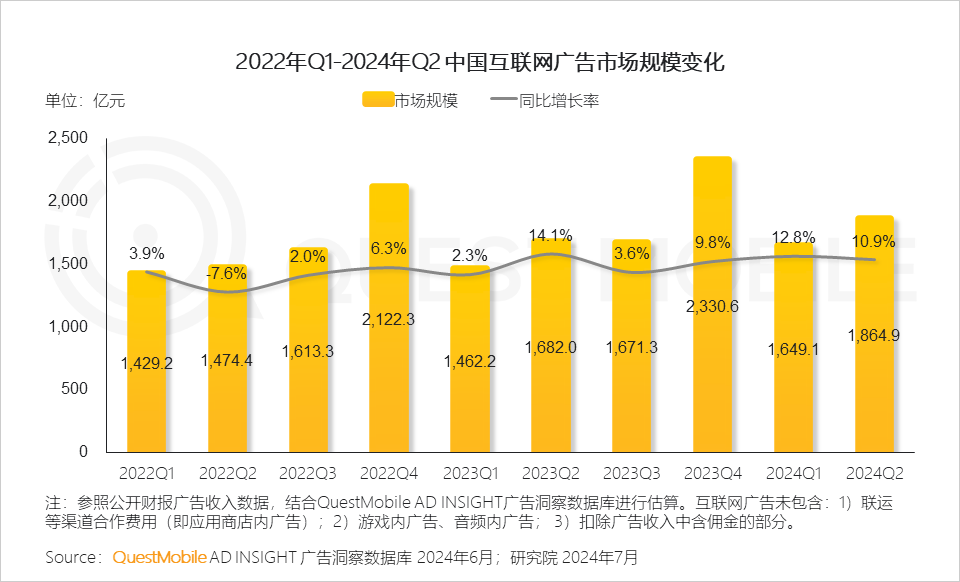 QuestMobile数据显示,2024年Q2互联网广告市场规模达到1864.9亿元,同比增长了10.9%。而作为曾经国内广告收入最高的互联网公司,百度却在行业大盘增长的时候下滑了。