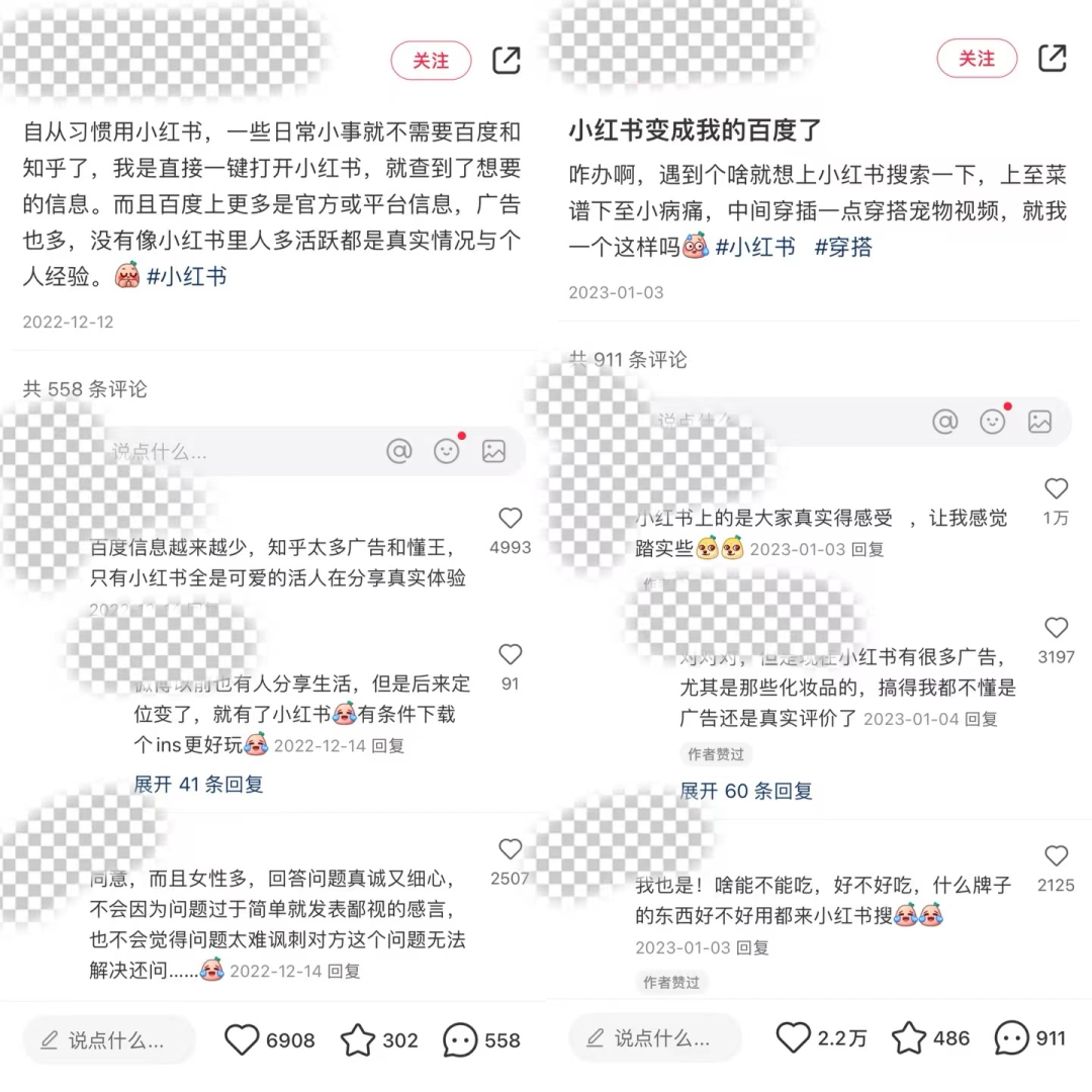 “把小红书当百度用”、“遇事不决问小红书”,在小红书平台上许多用户都会反馈这类声音,并且获得不少用户互动并分享同样的感受。
