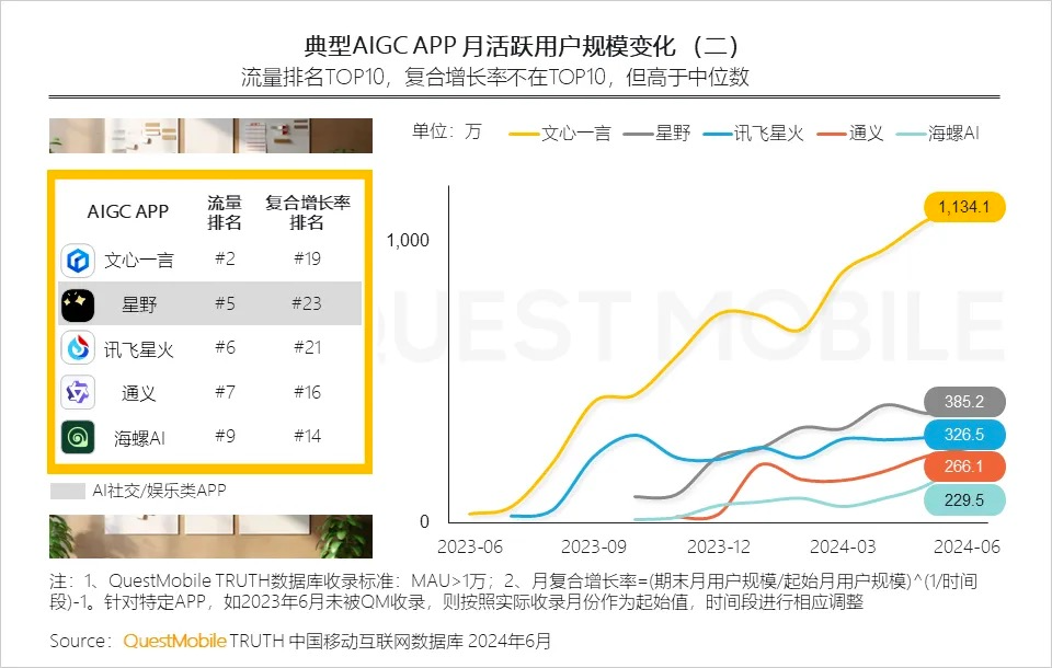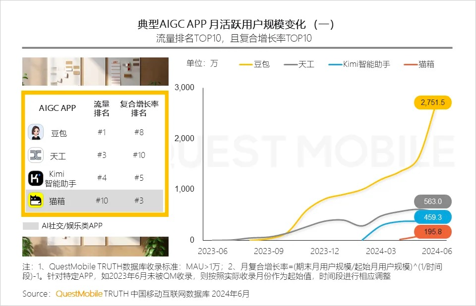据QuestMobile数据,字节跳动的豆包APP在6月份的月活跃用户再创新高,达到了2752万;而百度的文心一言在6月份的月活跃用户虽然同样创下纪录新高,但仅达1134万。