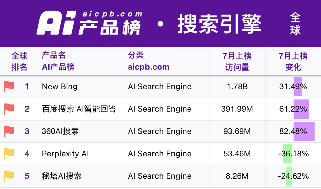 据「AI产品榜」发布的7月榜单,百度搜索的Ai智能回答位列「AI搜索引擎」榜第二,排列第一的为NewBing。