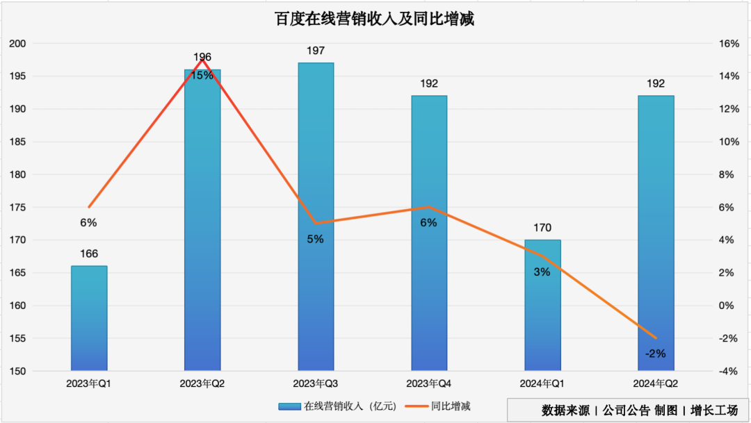 8月22日,百度发布2024年Q2财报,在线营销收入为192亿元,同比降低2%。这是连续6个季度以来,在互联网广告大盘保持增长的情况下,百度在线营销收入首次陷入下滑。