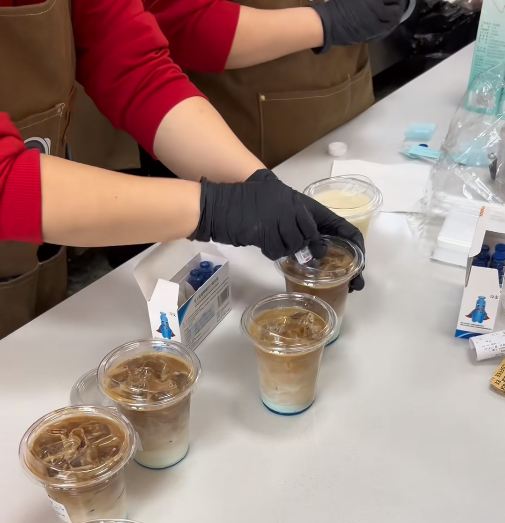 原本是一次创新之举,但是让人大跌眼镜的操作是,工作人员竟是直接将拆封的蓝瓶补剂直接加到咖啡中,再将拆封的小蓝瓶倒置,瓶中的口服液会缓缓流入杯中与咖啡混合。