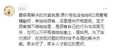 还有人提出了解决方案,建议将咖啡和口服液单独售卖,让顾客自己添加,这样插不插入咖啡里,是顾客的行为,与店面无关,也可以不开瓶插入咖啡杯口纯装饰用。