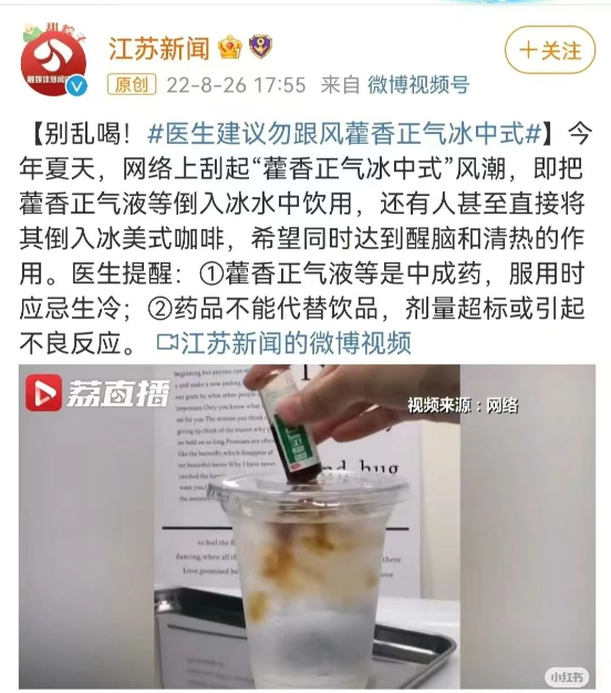 医生早已提醒,药品不能当饮品,建议网友别跟风乱喝。本意是为了预防中暑,但很可能对肠道有刺激作用。冰美式本身就是加冰块的,有刺激作用,如果加入藿香正气口服液或风油精会导致胃肠道发生短期痉挛,出现呕吐的症状。同时她还提醒,有些人可能会对风油精中的樟脑过敏。