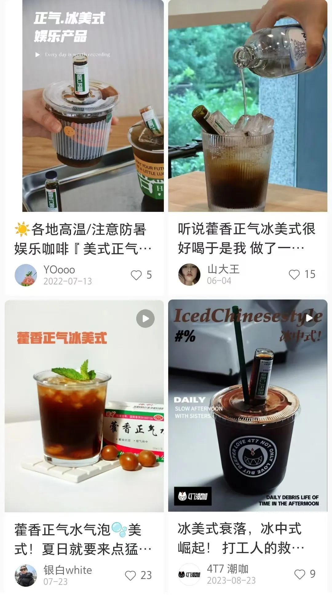 与哈药六厂咖啡的做法一样,有的是在冰美式中倒入藿香正气口服液,有的是直接在冰美式的吸管口倒插一支。