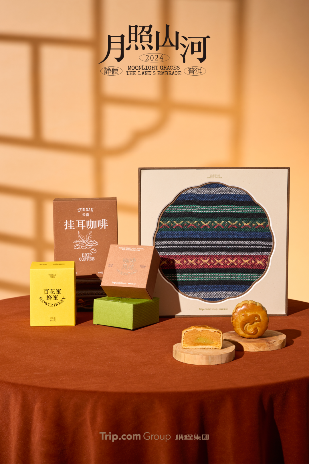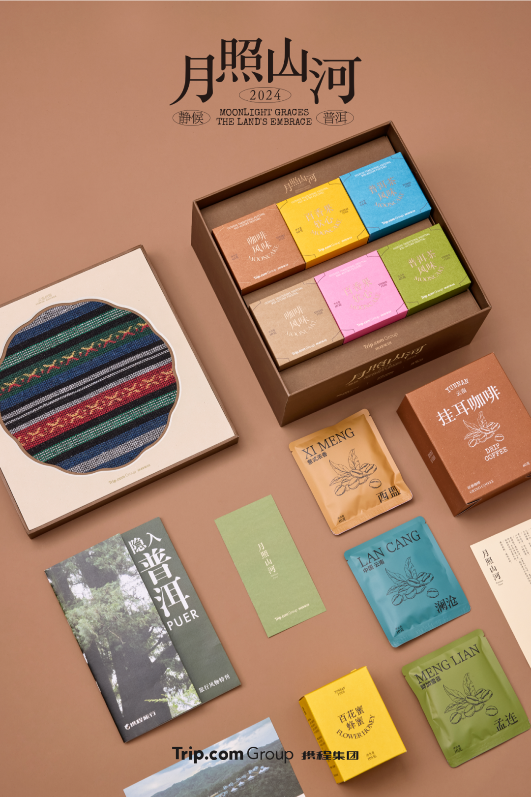 今年的中秋「旅行风物」礼盒,是携程遍访「云南绿三角」,探寻云南当地民艺风物所得的灵感,甄选澜沧普洱茶、孟连咖啡、西盟织锦/百香果,以传统工艺结合现代简约风设计,匠心制作织锦画框、风味月饼、挂耳咖啡、百花蜂蜜、地方特刊,共同打造了这一份「月照山河」中秋礼盒。