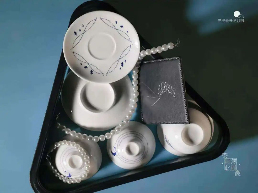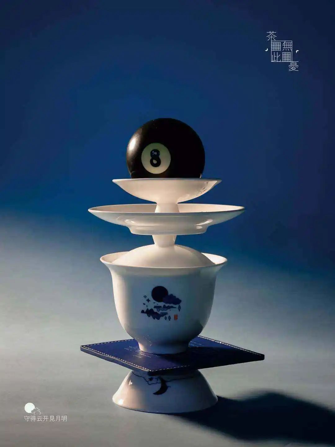 礼盒内有一套茶具,一个盖碗,两个杯子和两块杯垫。 杯子分别是两个半月,拼接在一起能组成一轮满月。