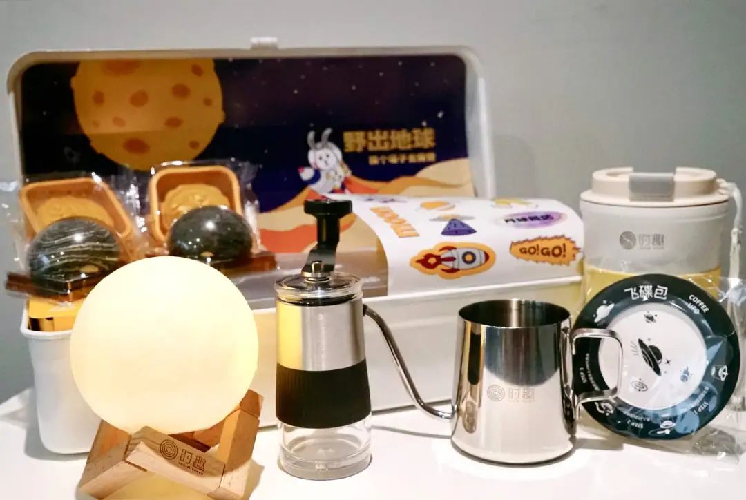 打开星际感满满的礼盒,除了奶黄流心糙米月饼、贺卡和创意贴纸,最抓眼的是一系列实用的手冲咖啡工具:咖啡杯、手摇咖啡磨豆机、手冲壶,以及飞碟包滤纸。