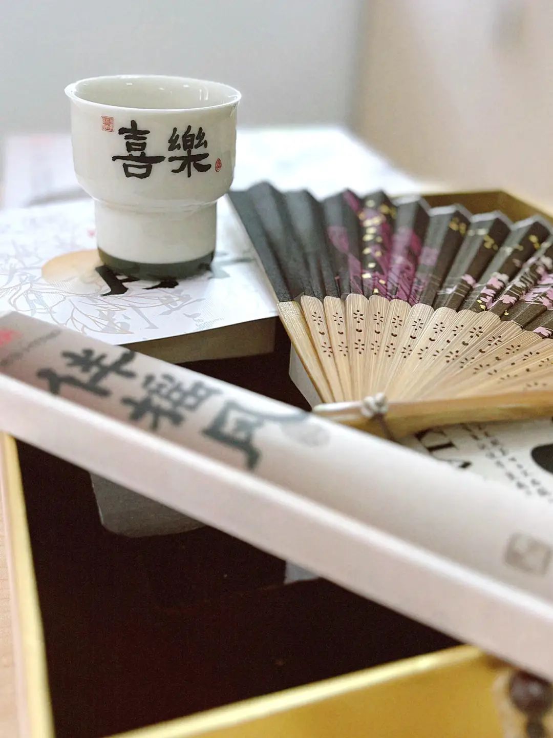 书法杯,采用德化陶瓷制作工艺流程。杯身印有“喜乐”二字,文化气韵浓厚,是书法与陶瓷的自然结合。