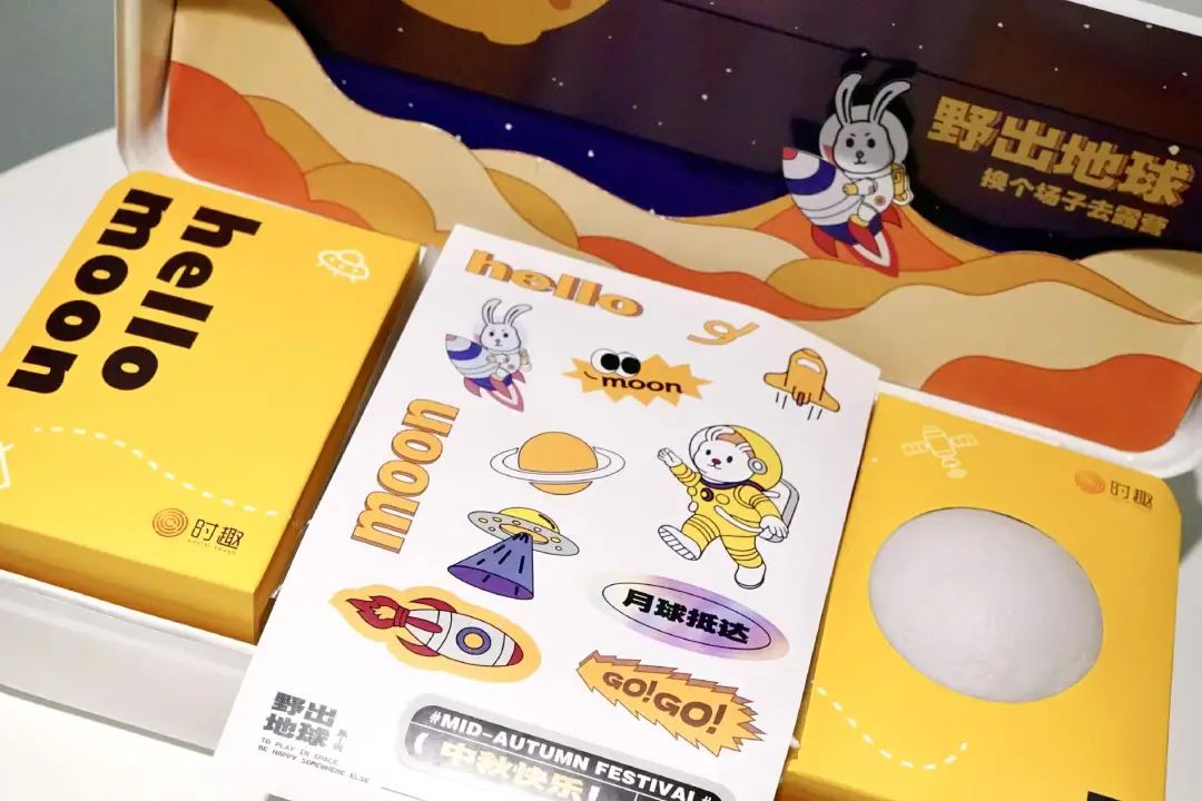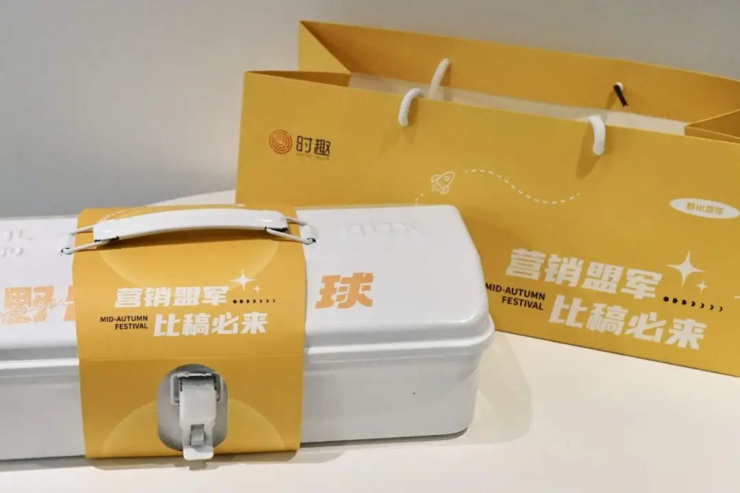 时趣的中秋礼盒是带着「野心」来的,以「野出地球」为设计理念,象征着在营销的星际旅行中,寻求创新和变革的态度。礼盒上醒目的「营销盟军 比稿必来」寓意探索新领域的积极姿态,就像是在露营中不断战胜困难,享受每一次户外探险带来的新鲜感与成就感。