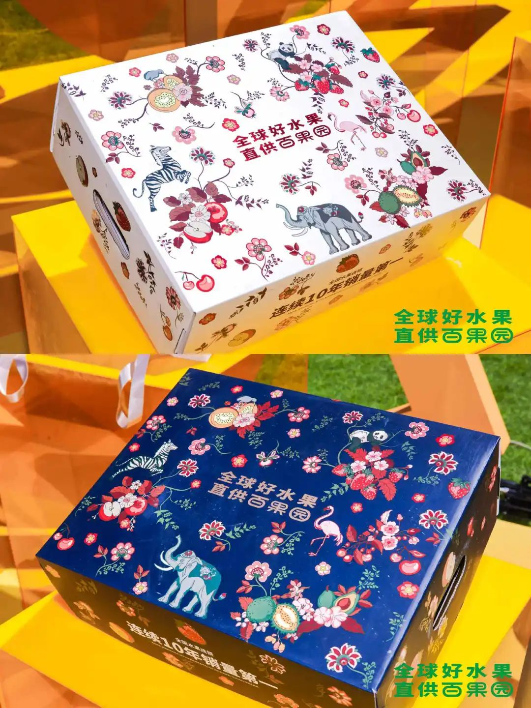 「探寻全球好果」主题礼盒,盒上展示着不同国家的地标水果,也表达了百果园走遍全球,为顾客探寻好果,带来水果好生活的品牌理念。