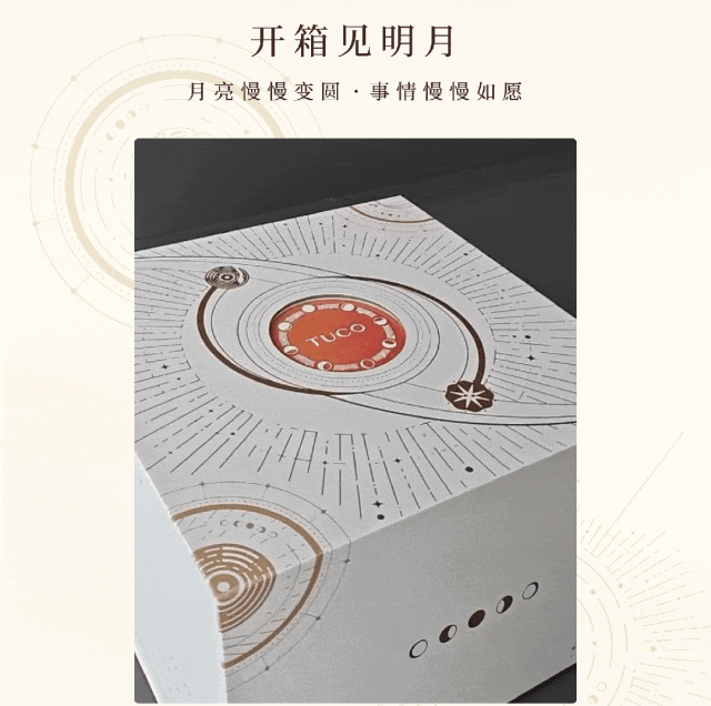 今年TUCO推出的这款「月光之歌」中秋礼盒,灵感融汇了金秋满月之辉与悠扬旋律,以描金几何美学,诠释无尽浪漫。开启瞬间,旋转月轮缓缓圆满,寄寓美好渐圆之意。