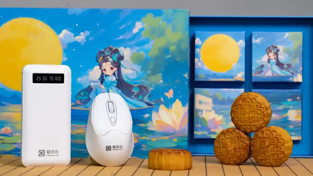 易点云今年的中秋礼盒在设计上汲取了印象派大师克劳德·莫奈的经典画作《睡莲》的精髓,Q版嫦娥和玉兔用易点云的电脑与天宫相链接。
