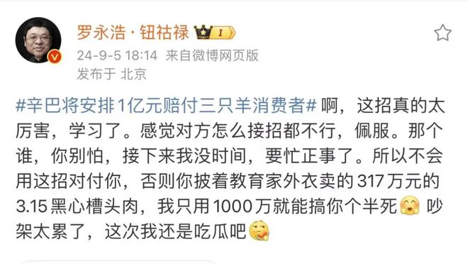 又要举胖东来的例子了,三只羊完全可以拿出所有的证据,而不是忙着删帖。头部出问题,一点也不稀奇,稀奇的事不出问题,一直当“圣人”。你看,这几天,罗永浩不就刚因为卖了假洋牌的月饼,迅速给网友跪了嘛。