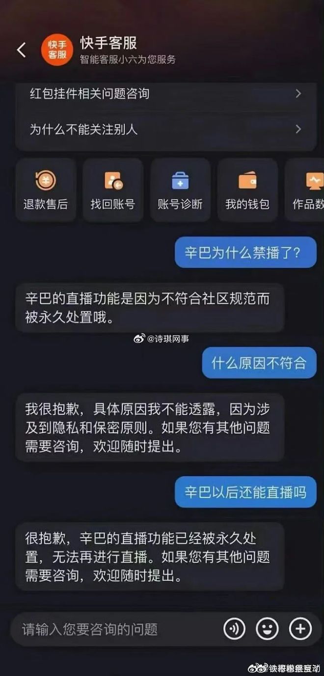 今天早上,又有截屏流出,疑似快手客服回应,辛巴已经被快手永久封禁!