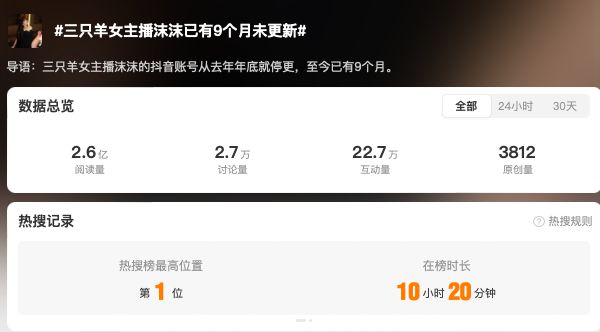 而#三只羊女主播沫沫已有9个月未更新#相关话题冲上热搜,引发猜测。