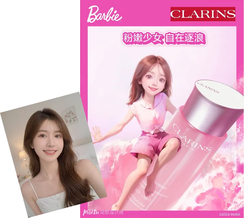 品牌选择了和美图秀秀进行合作,以品牌联名主视觉为模型训练基础,定制了夏日冲浪造型场景的AI魔法芭比特效。