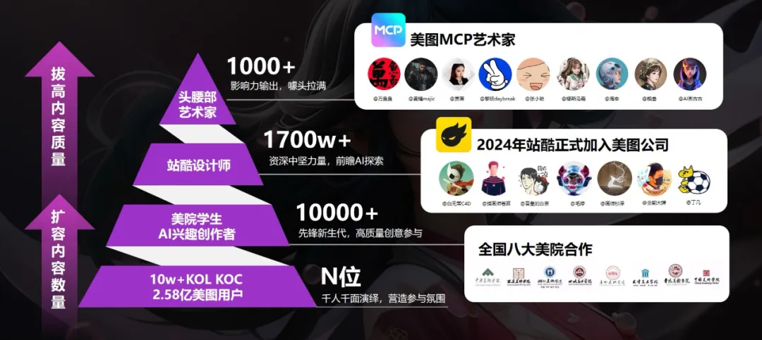 营销“老司机”看下面的图就明白了。今年美图矩阵加入了站酷之后,拥有了一千七百万的设计师中坚力量,加上行业顶尖设计师的塔尖,及由美院学生、独立设计爱好者构成的基座,建构出了一个覆盖多圈层的AI共创金字塔。
