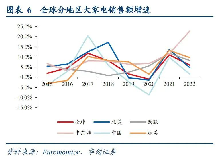 以大家电为例,中国、北美、西欧、日韩、澳新都是比较成熟的市场,占比重,但增速不大,过去10年在5%的增速左右,而拉美、东南亚、东欧、中东非作为新兴市场,增速在7%—10%区间,且在拉美、中东非等区域近年来还有逐渐加速的迹象。比如2022 年中东非地区大家电销售额增速达到了22.8%。