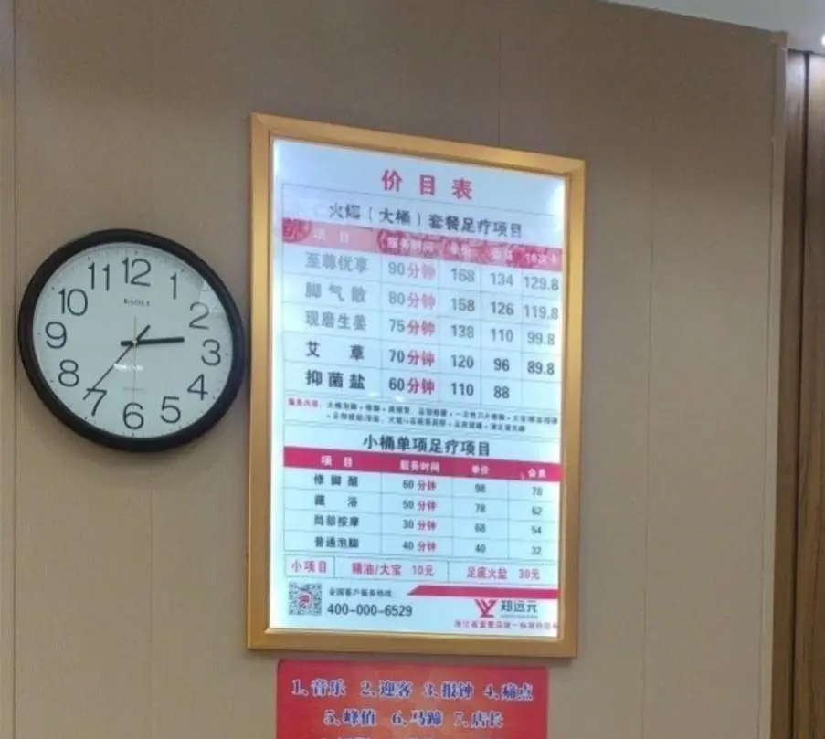 能被称为“按摩界的蜜雪冰城”,不仅仅是因为庞大的门店数量,还有亲民的价格。郑远元修脚店的门店价目表中显示,普通的40分钟泡脚项目收费在40元左右,会员则只需要32元,和动则百元的高端足浴店相比,这价格能让打工人轻松实现“修脚自由”。