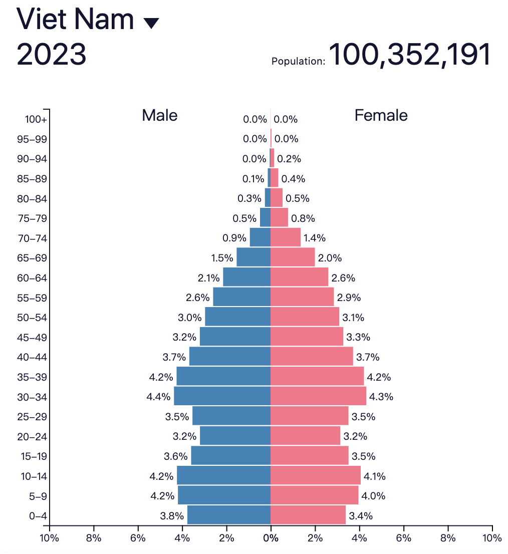 截至2023年底,越南统计局数据显示人口越南人口已达1.003亿,是世界上第十五个人口破亿的国家,其中适龄劳动人口(15-64岁)占比近70%,越南是一个相当年轻的国家,日本的适龄劳动人口是59%。