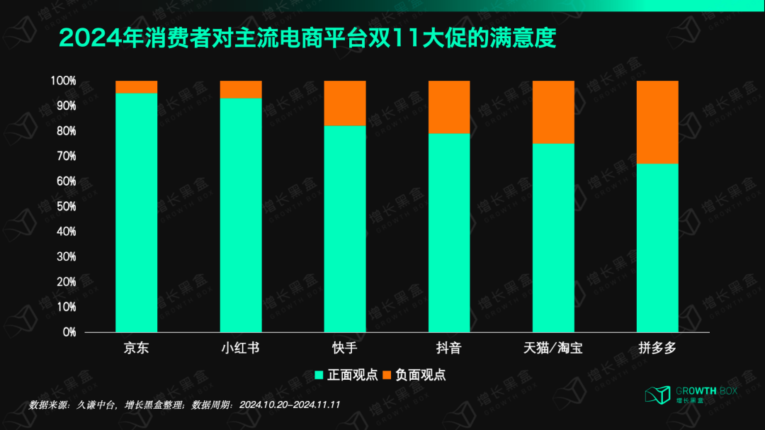 于是,我们研究了目前主流电商平台,发现2024年双11消费者满意度排名分别是:京东、小红书、快手、抖音、天猫/淘宝、拼多多。