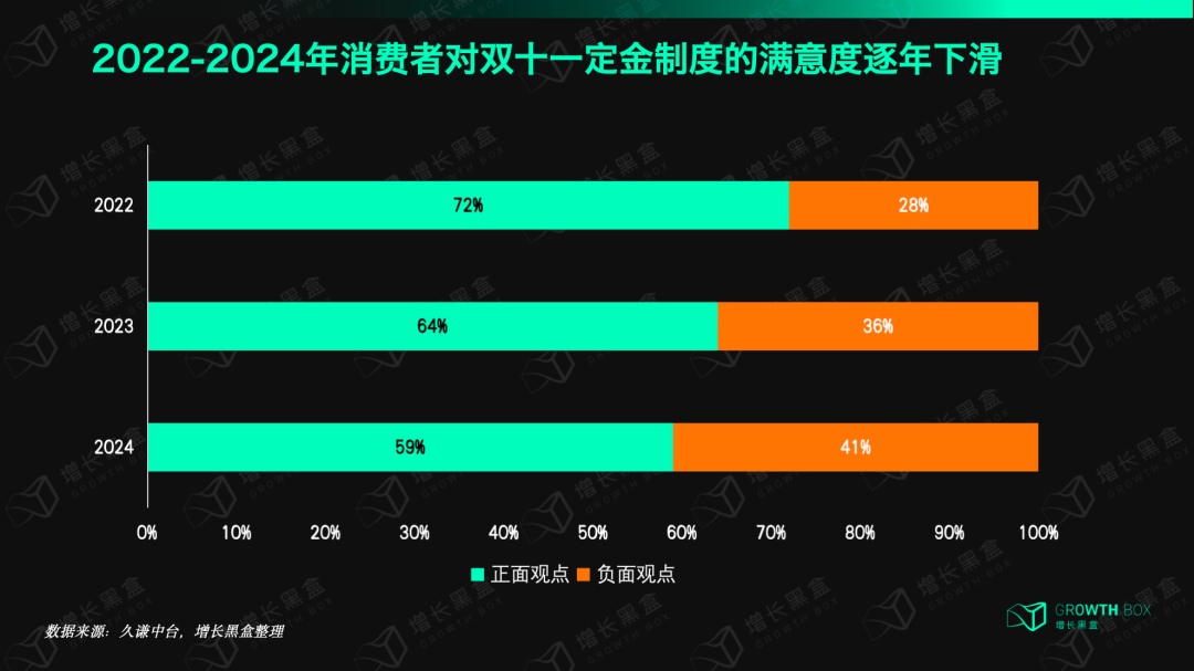 更重要的是,近三年,消费者对预售定金机制的满意度呈显著下滑态势,消费者关于双11定金机制的正负观点比例从2022年的72:28跌至2024年的59:41。