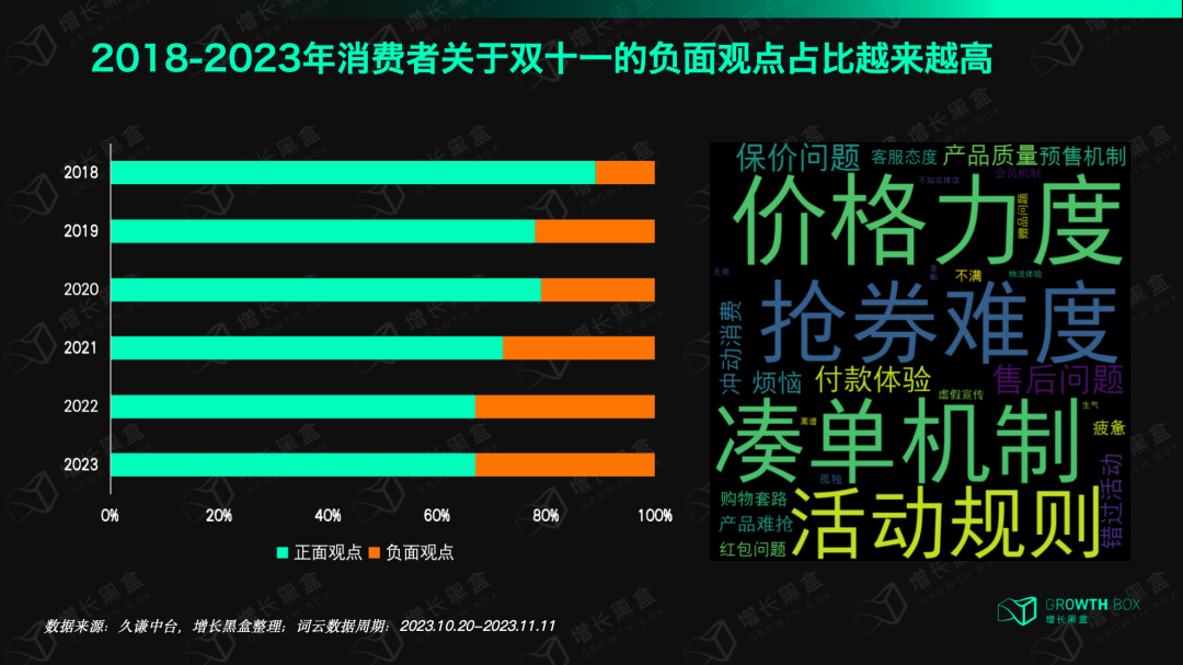 另一组数据也映射出相同的趋势,2018年以来,消费者关于双11的观点中,负面观点占比逐渐增加。