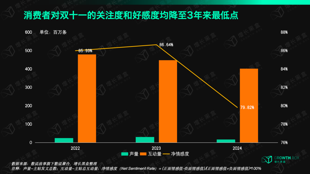 但我们发现, 2024年双11期间,社媒平台上关于双11的声量、互动量均低于2022、2023年,达到近3年来最低。不仅关注度变少了, 今年消费者对双11的好感度也降至3年来最低。反映在消费行为上则是,近几年主流电商平台、头部消费品牌的双11GMV增速已经明显放缓。