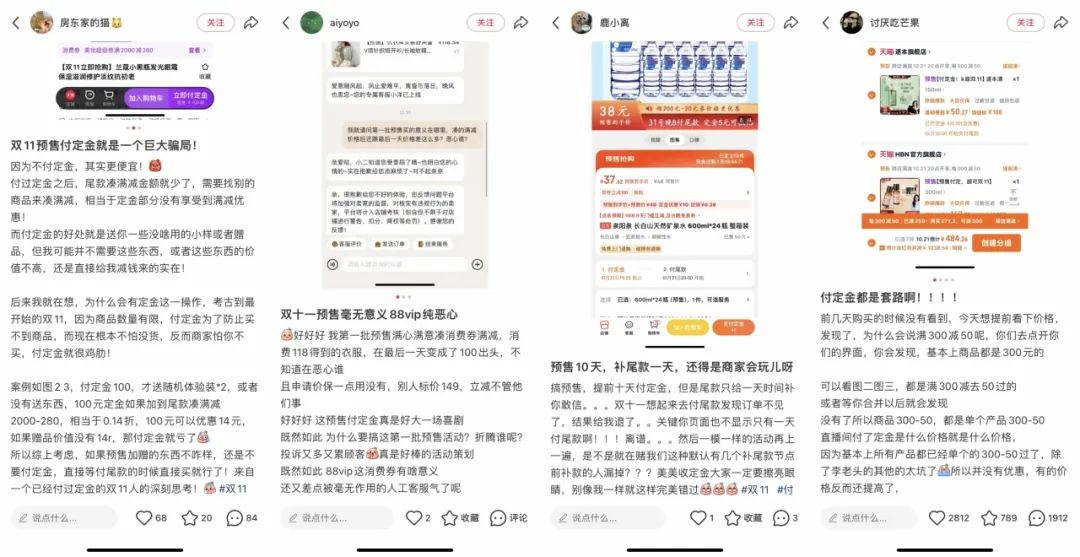 受这些因素影响,消费者对预售、付定金的兴趣不再强烈,反而选择在10月31日尾款日全款购买,或者直接在双11当天购买。小红书上有消费者生动总结:“双11真正便宜的就3天:10月31日、11月10日、11月11日。”