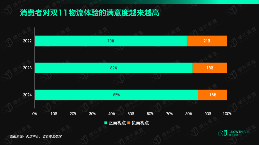 增长黑盒认为,物流体验的满意度提升,是各大平台在物流时效、物流覆盖度上不断竞争的结果,更是平台之间在物流服务上的破壁、融合的共同成绩。