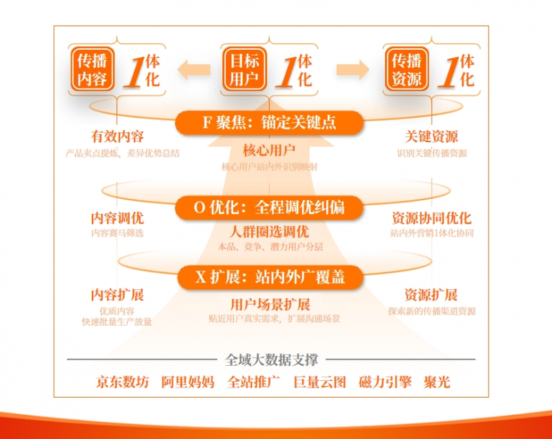 聚焦(Focus):即基于大数据洞察,进行全链路整合视野分析,锚定营销的关键点,聚焦有效内容、核心用户以及关键资源,做到策略可输出;
