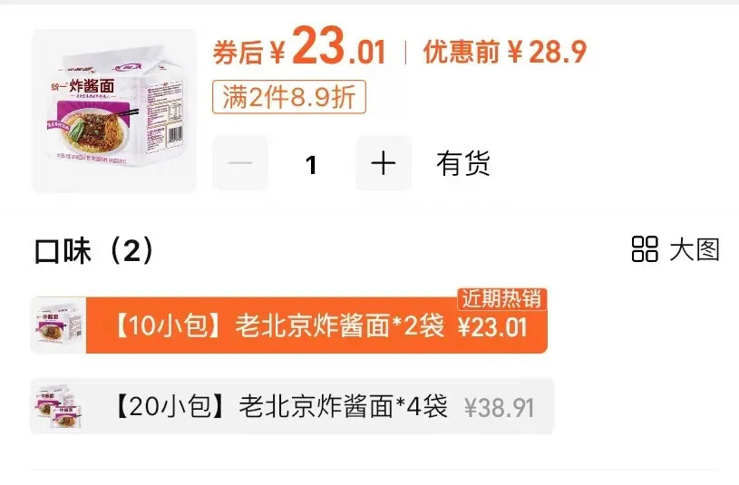 此次卷土重来后的统一炸酱面主打“老北京喜欢的炸酱味儿”,在价格上同样延续以往的性价比优势,采用五连包的包装方式,根据其天猫官方旗舰店的价格折合算下来每块零售价约2.3元。