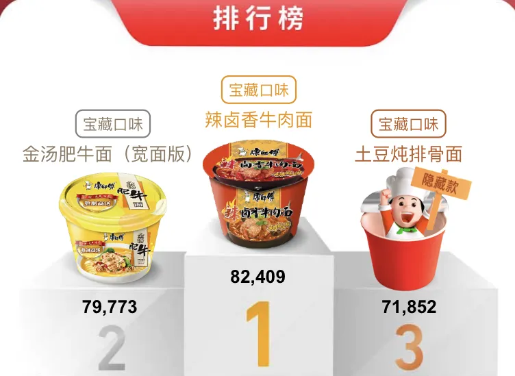 目前来看,在消费者的投票中,位列排行榜前三的经典产品分别是辣卤香牛肉面、金汤肥牛面(宽面版)、土豆炖排骨面。不仅通过投票的方式增强了大众的参与感,而且评论区内,网友们还纷纷喊话:辣卤香牛肉面为什么停产、能不能出个大礼包链接、双椒拌面必须上......甚至一些曾经的小众产品也上榜评论区被大家“求复活”。