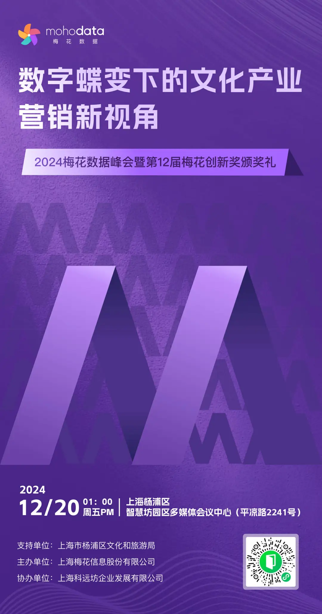 本届梅花数据峰会将于2024年12月20日在上海杨浦区智慧坊园区多媒体会议中心举办。我们邀请到了诸多业内资深人士参与并发表主题演讲,期待您前来现场与梅花之友共同就数字科技、文化传播、营销创新等行业领域进行深度讨论和交流。